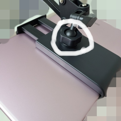 태블릿을 장착한 모습입니다. 구슬은 적당히 조여 주시고요, 다행히 태블릿은 잘 거치가 됩니다. 후기에 아이패드는 잡아주는 게 조금 무리가 있다고 하네요. 저는 갤럭시 탭 6 lite 제품을 사용하고 있고요. 거치 잘 됩니다.
